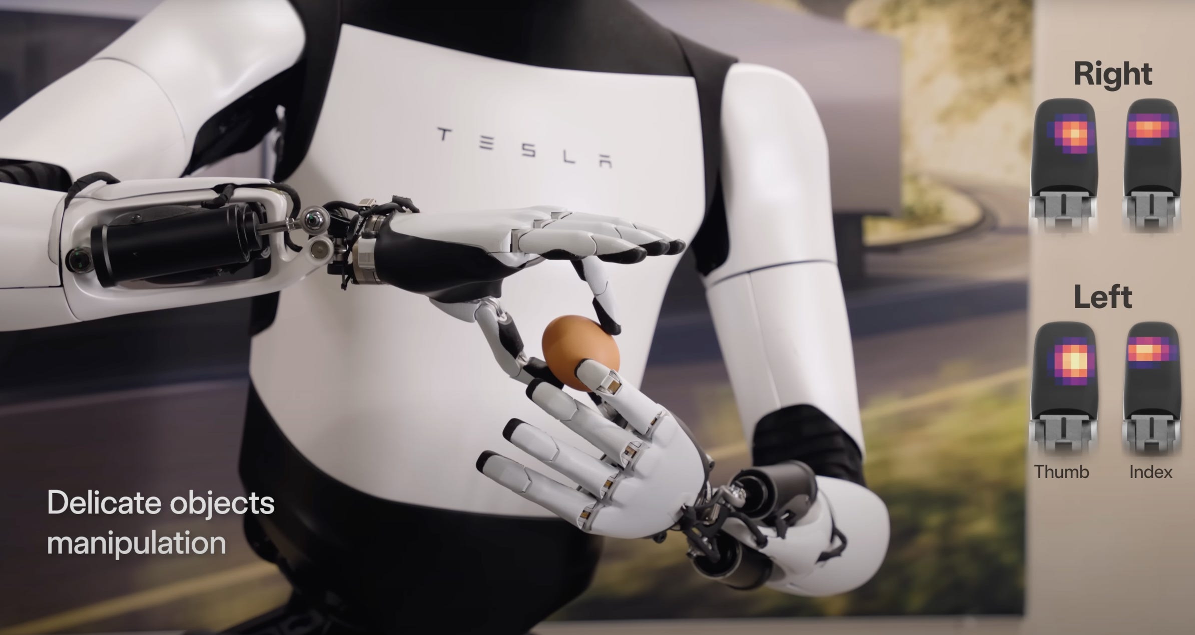 Hand and Finger Upgrades for Delicate Object Manipulation: Perhaps the most notable upgrade is in the hands and fingers of the Gen 2 model. The hands are faster and now offer up to 11 degrees of freedom. The robot is also equipped with tactile feedback, enabling it to delicately manipulate objects, such as picking up and handling an egg without breaking it – a task demonstrated in Figure 3. This capability is significant as robotic grippers typically struggle with delicate and brittle objects. The heat maps on the fingers in the image suggest real-time tactile feedback processing.