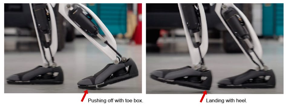 I equally love and fear to see how far these robotics have come. Coming at it from a physical therapist’s perspective though - I think people don’t realize just how hard it is to walk. People believe that the hands and upper body are the most complex, but walking is by far some of the most challenging tasks we have to teach to people. I love to see the toe push-off on Tesla’s model, but it’s almost not enough. I also see that in neither video that the “knees” never are fully extended (straight). I’m sure there’s a mechanical component as to why they’re designed to keep that joint flexed, but it makes the robots look funny. There are probably a few things they’re lacking in the models they have currently that I would say need attention to improve their gait (walking). First, they need more articulation in the feet (more movable joints) rather than one hinge joint at the ankle and the other at the toes plus a spring. Specifically they need ankle plantar flexion, the ability to point the ankle down like a dancer, to get better toe push off and knee extension. Second, the torso needs to be able to rotate forward/back as it walks. These are just two of many suggestions. Here’s a video breaking down the mechanics of gait if you’re further interested!